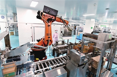 12月12日,在石家庄市栾城区神威药业集团的注射剂车间,机器人在进行小盒装箱工作。