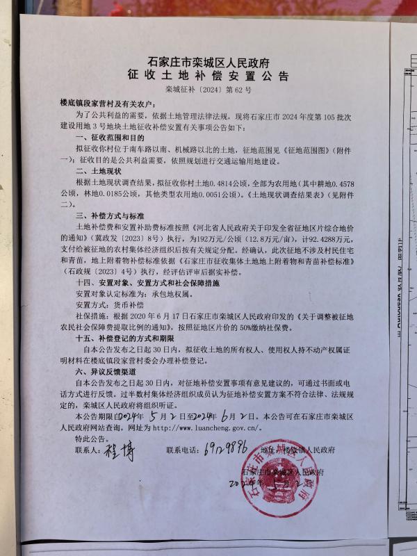 栾城区楼底镇段家营村征收土地补偿安置公告