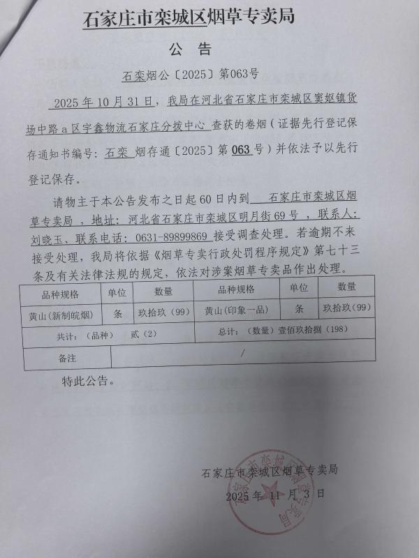 栾城区烟草专卖局无主案件公告(063)