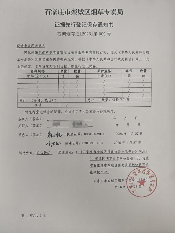 栾城区烟草专卖局先行登记保存通知书009
