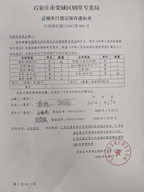 栾城区烟草专卖局先行登记保存通知书008