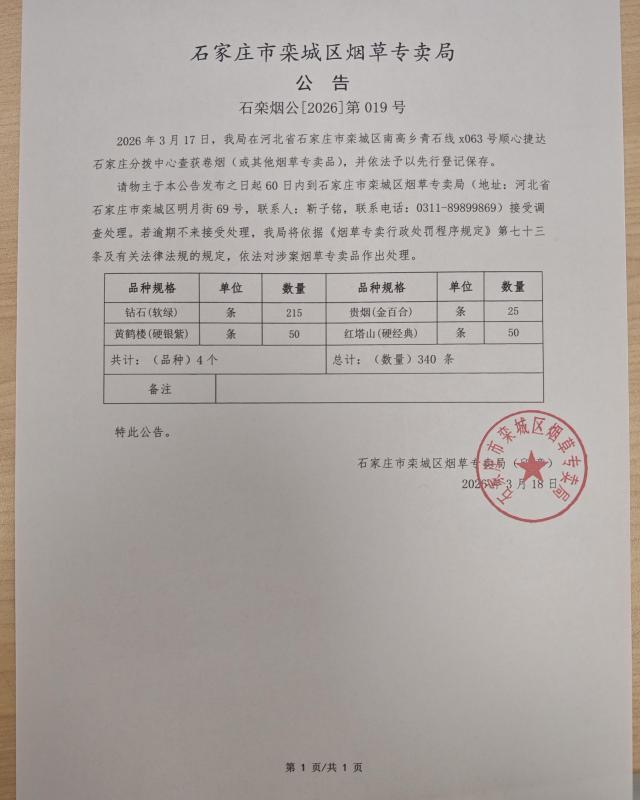 栾城区烟草专卖局查找当事人公告-019