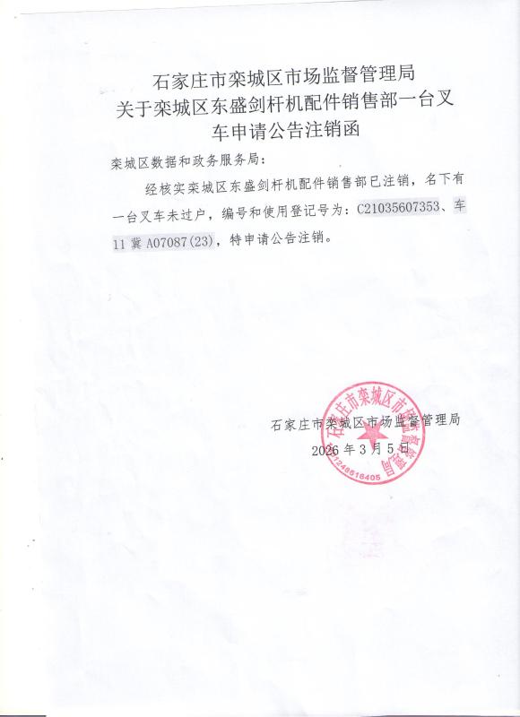 附:《石家庄市栾城区市场监督管理局关于栾城区东盛剑杆机配件销售部一台叉车申请公告注销函》