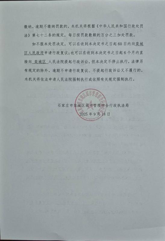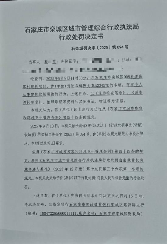 石栾城罚决字〔2025〕第094号 冀A33457D存在个人从事建筑垃圾运输