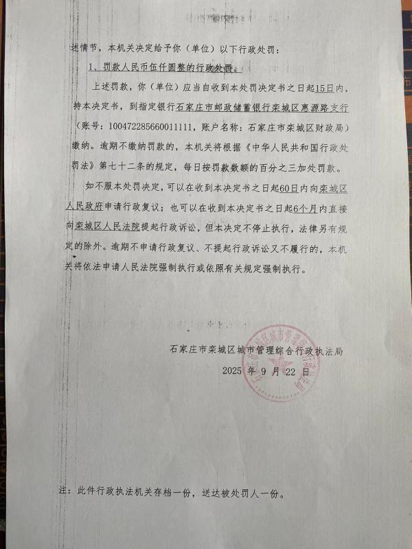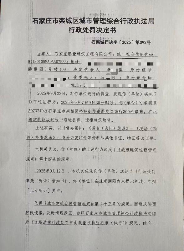 石栾城罚决字〔2025〕第092号 车辆冀A07374D在运输建筑垃圾过程中沿途丢弃、遗撒建筑垃圾
