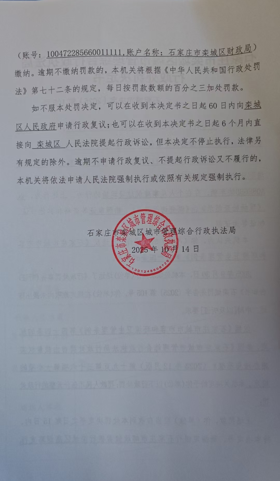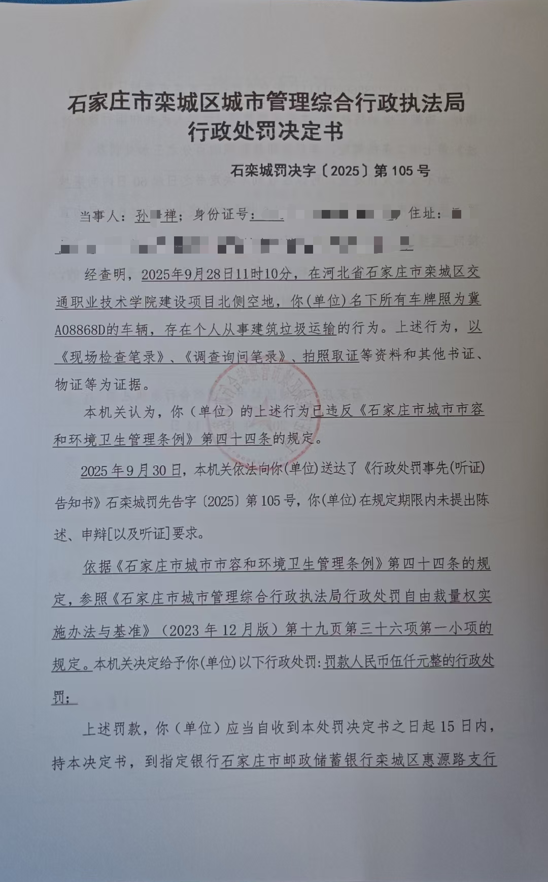 石栾城罚决字〔2025〕第105号 冀A08868D个人从事建筑垃圾运输