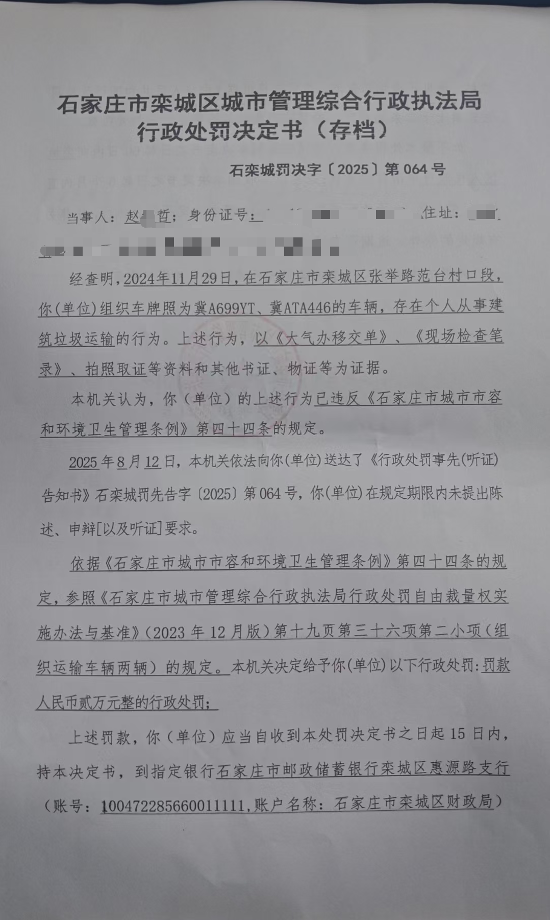 石栾城罚决字〔2025〕第064号 冀A699YT、冀ATA446个人从事建筑垃圾运输