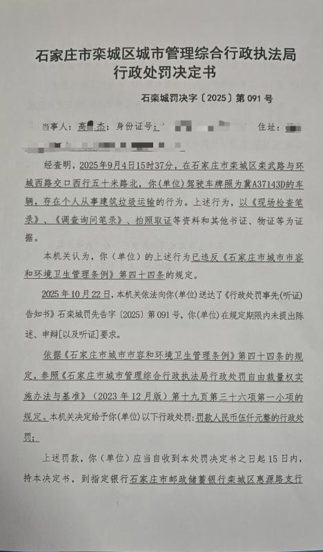 石栾城罚决字〔2025〕第091号 冀A37143D个人从事建筑垃圾运输