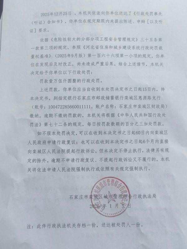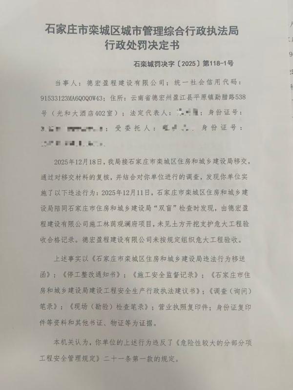 石栾城罚决字〔2025〕第118-1号 德宏盈程建设有限公司未按规定组织危大工程验收案