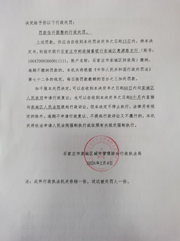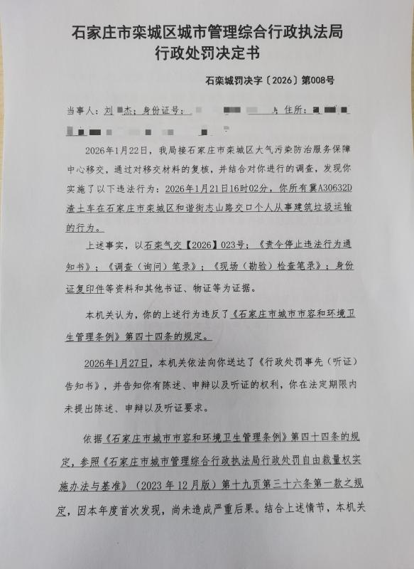 石栾城罚决字〔2026〕第008号 冀A30632D渣土车个人从事建筑垃圾运输