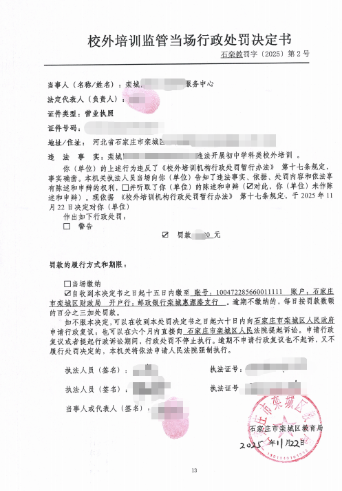 栾城区教育局行政处罚决定书石栾教罚字 【2025】第2号