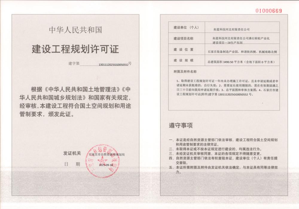 拓蓝科技河北有限责任公司沸石转轮产业化建设项目—3#生产车间建设工程规划许可证