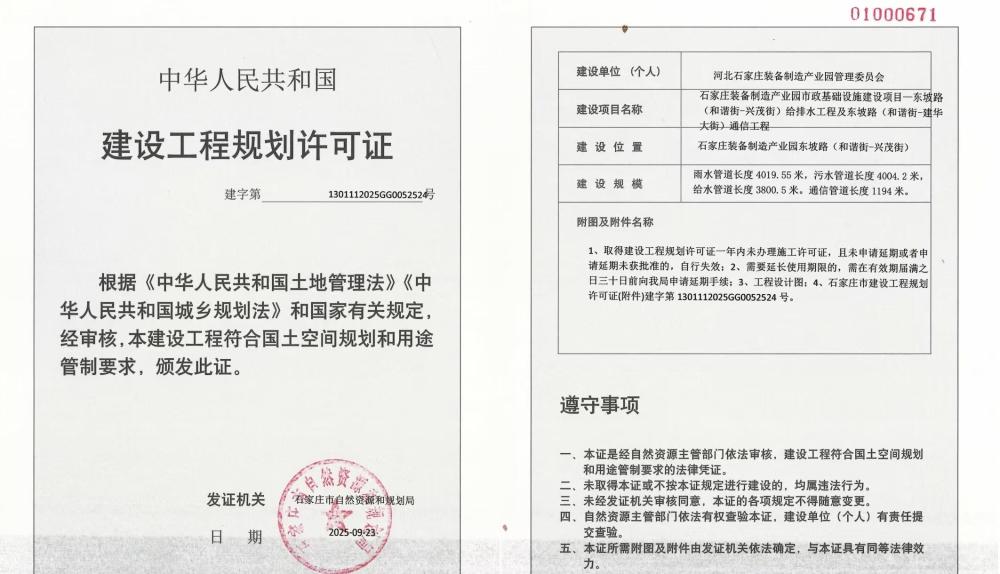 东坡路(和谐街—兴茂街)给排水工程及东坡路(和谐街-建华大街)通信工程建设工程规划许可证