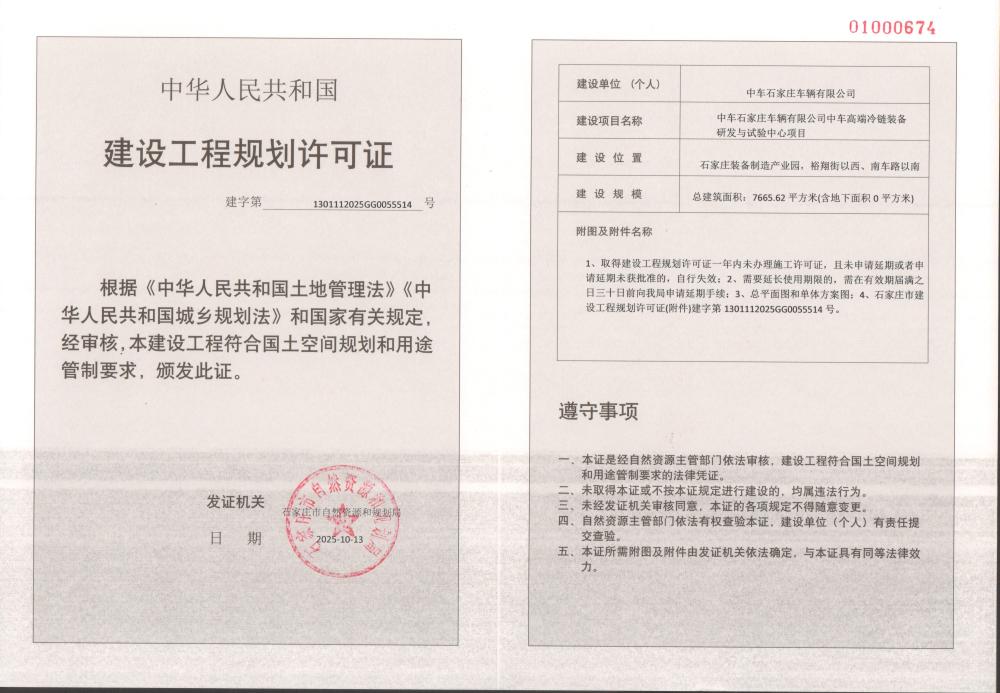 中车石家庄车辆有限公司中车高端冷链装备研发与试验中心项目建设工程规划许可证