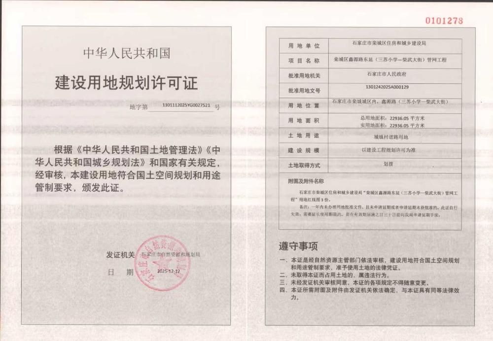 “栾城区鑫源路东延(三苏小学—柴武大街)管网工程”建设用地规划许可证