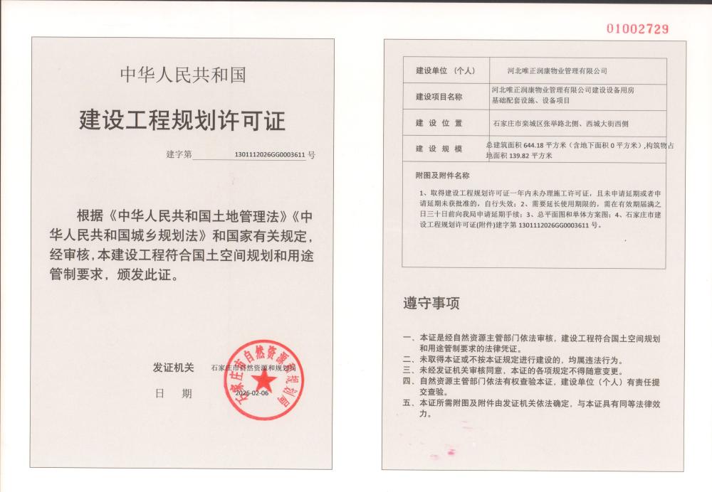 河北唯正润康物业管理有限公司建设设备用房基础配套设施设备项目建设工程规划许可证