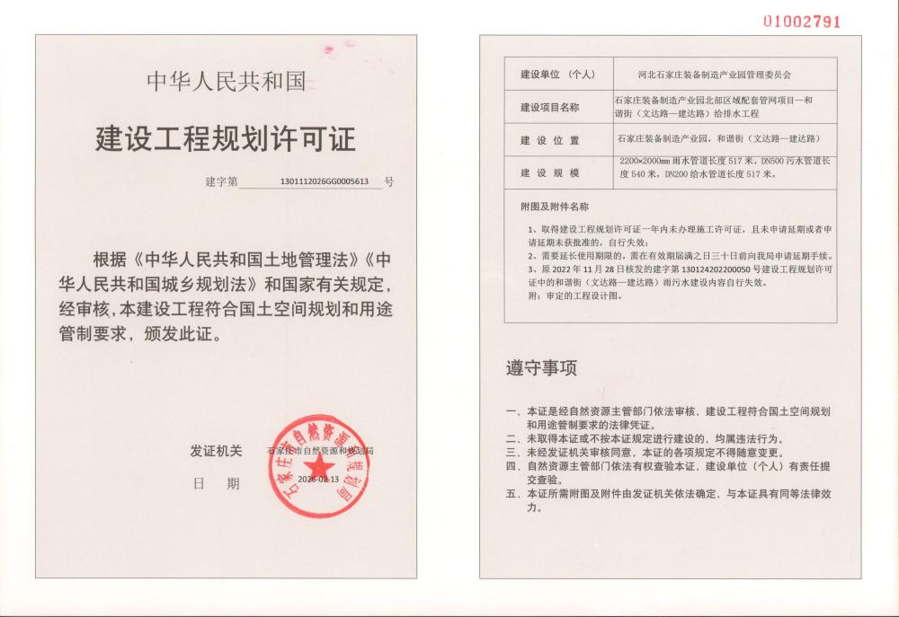石家庄装备制造产业园北部区域配套管网项目一和谐街(文达路一建达路)给排水工程建设工程规划许可证