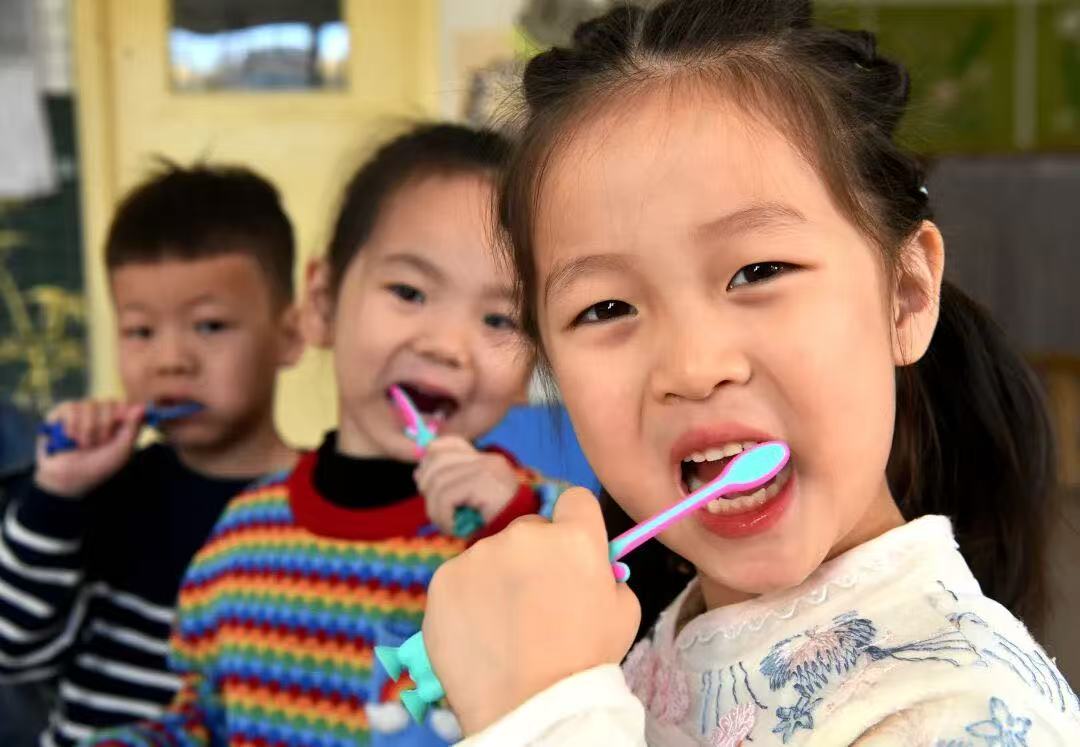 石家庄市栾城区第二幼儿园的小朋友们,在老师的指导下,练习正确的刷牙方法。