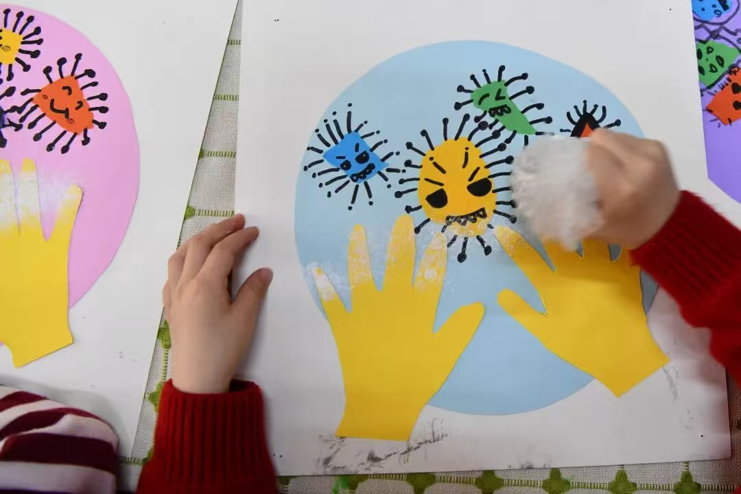 石家庄市栾城区第二幼儿园小朋友制作拓印画《吸走小怪兽》,在趣味创作中养成勤洗手的卫生习惯。