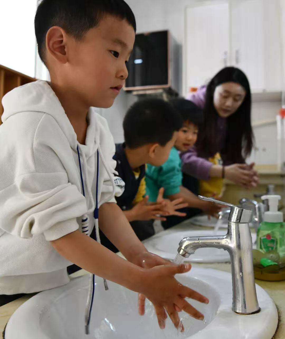 石家庄市栾城区第二幼儿园老师为小朋友们讲解“七步洗手法”。