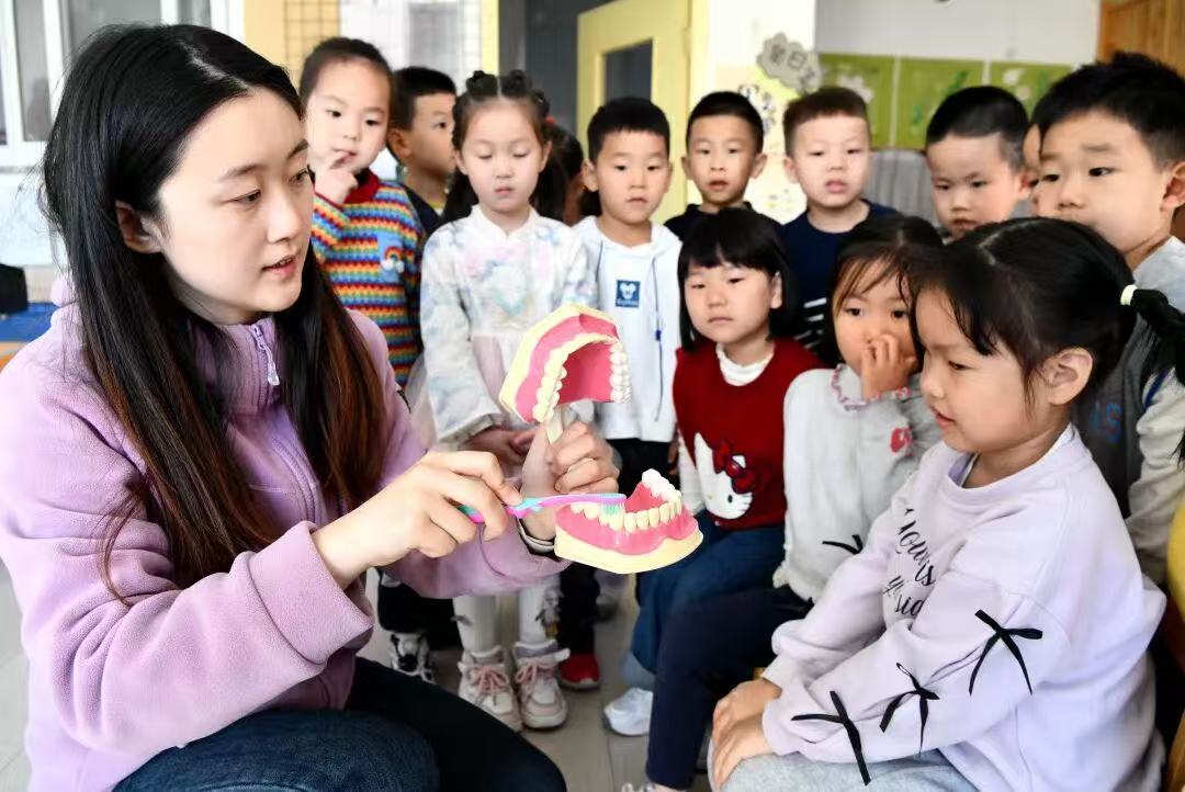 石家庄市栾城区第二幼儿园的老师给孩子们讲解爱护牙齿的相关知识。