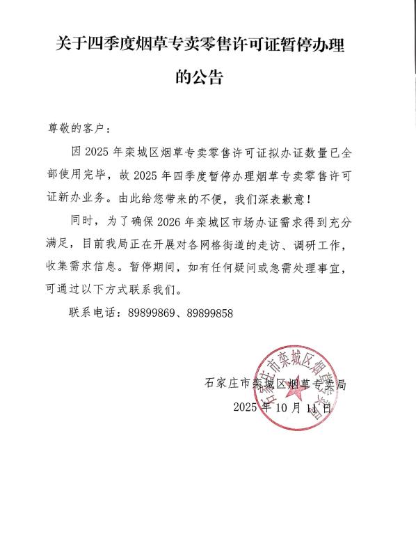关于第四季度烟草专卖零售许可证暂停办理的公告
