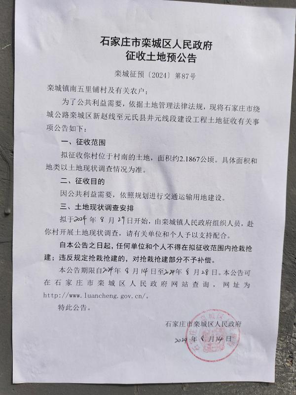 石家庄市栾城区栾城镇南五里铺村征收土地预公告