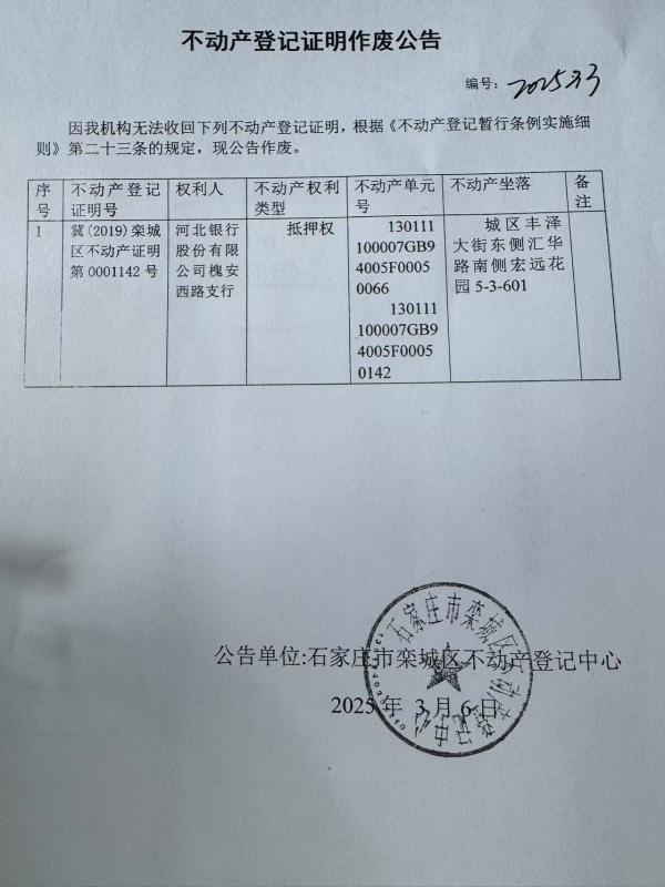 河北银行股份有限公司槐安西路支行不动产登记证明作废公告
