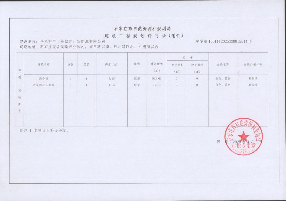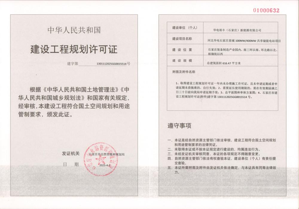 河北华电石家庄栾城100MW/400MWh共享储能电站项目建设工程规划许可证