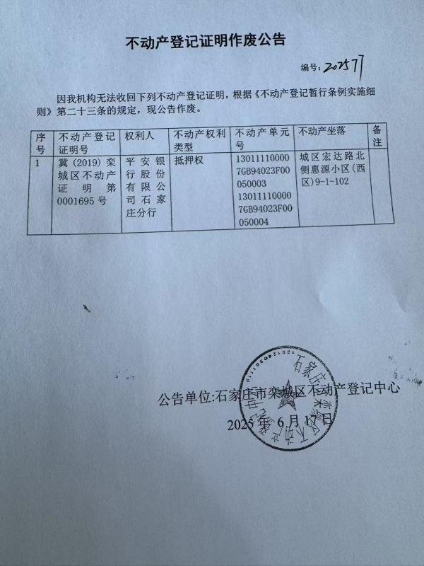 平安银行股份有限公司石家庄分行不动产登记证明作废公告