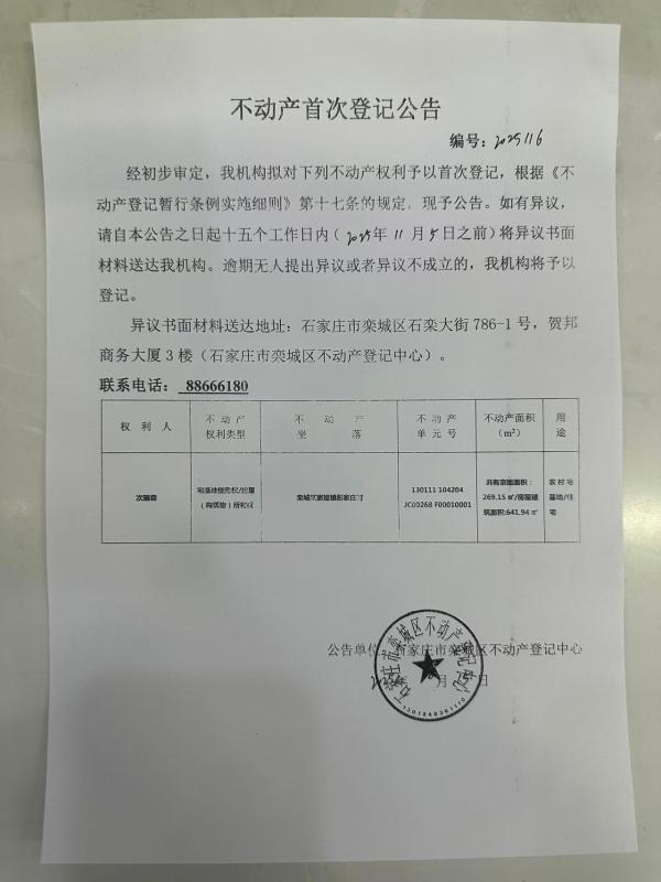 次瑞森不动产首次登记公告