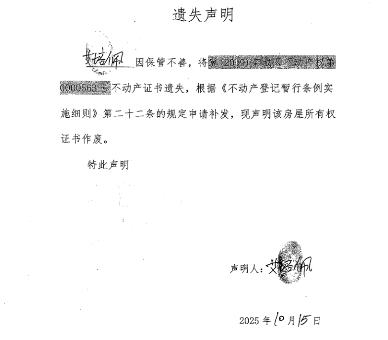 艾培佩不动产权证书遗失声明