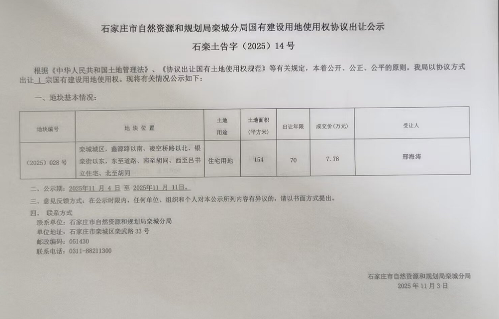 石家庄市自然资源和规划局栾城分局国有建设用地使用权协议出让公示