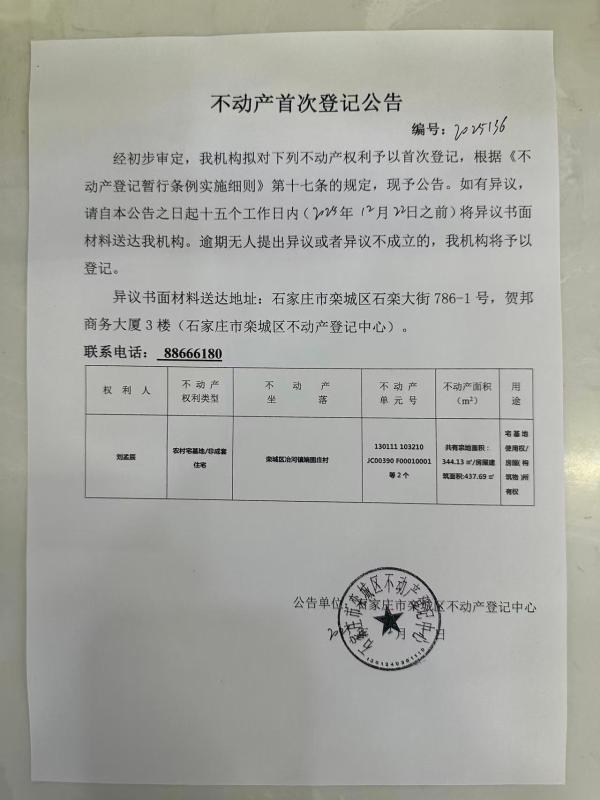 刘孟辰不动产首次登记公告