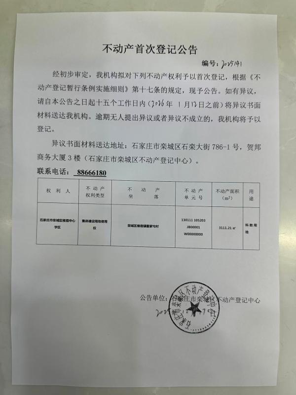 栾城区楼底中心学区不动产首次登记公告