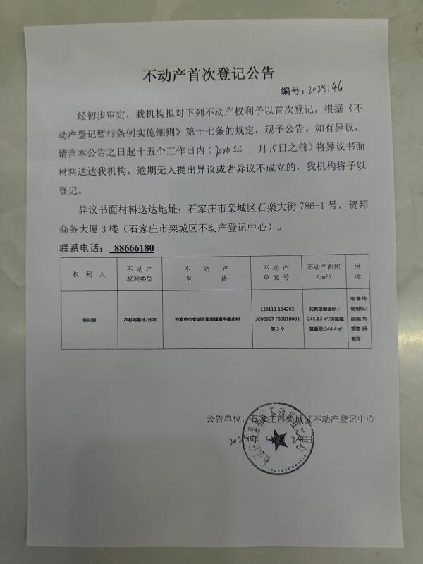 韩如朋不动产首次登记公告