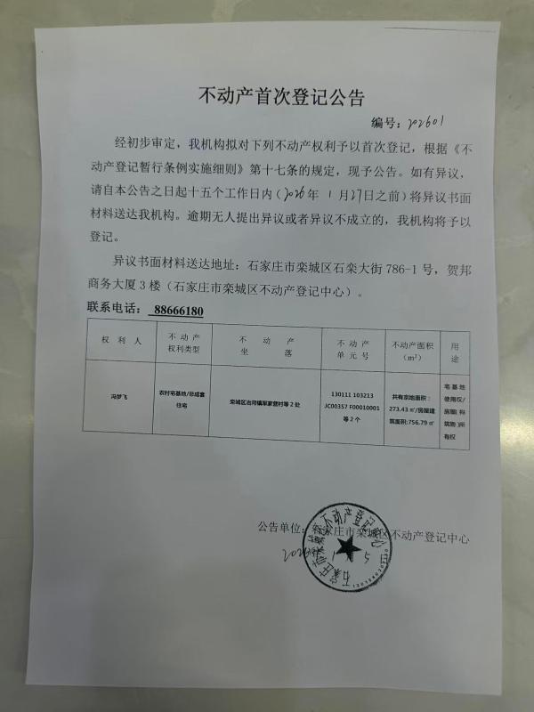 冯梦飞不动产首次登记公告