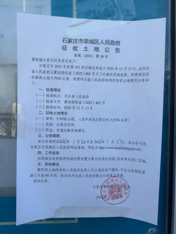 栾城区窦妪镇汪家庄村征收土地公告