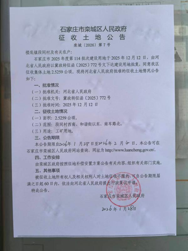 栾城区楼底镇段同村征收土地公告