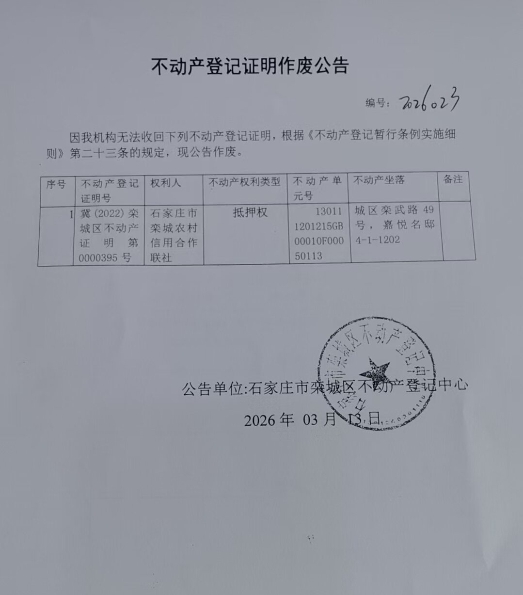 石家庄市栾城农村信用合作联社不动产登记证明作废公告