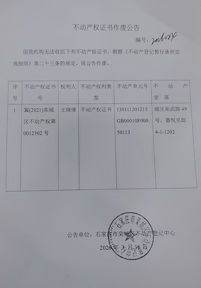 王晓璞不动产权证书作废公告