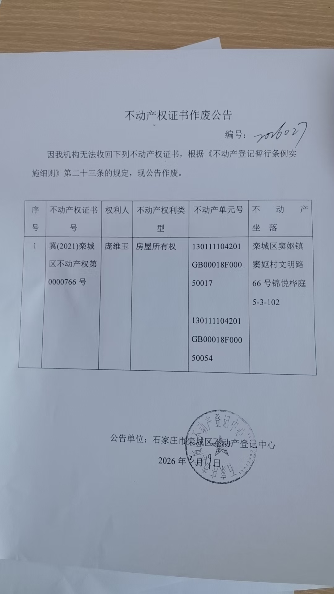 庞维玉不动产权证书作废公告
