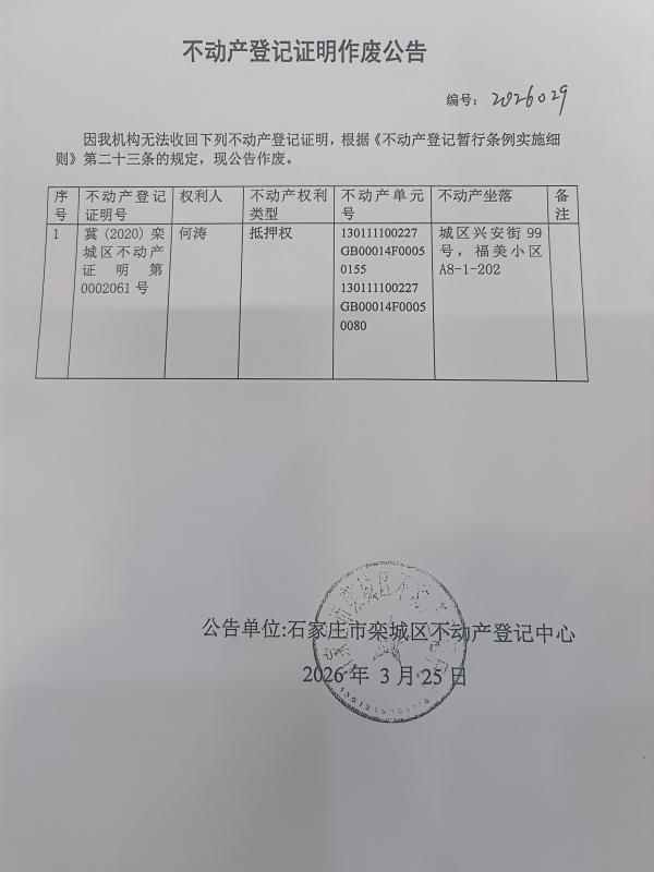 何涛不动产登记证明作废公告