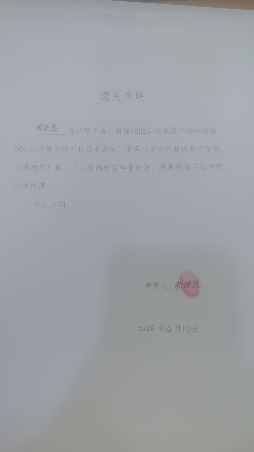 苏洪昌不动产权证遗失声明公告