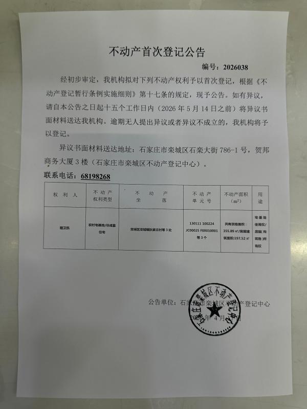程卫凯首次不动产登记公告