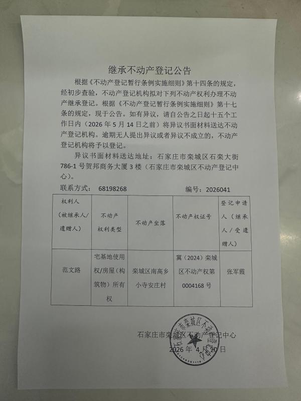 张军霞继承不动产登记公告