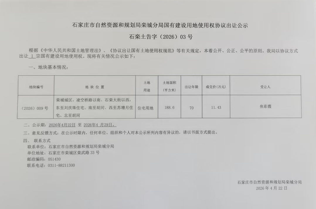 石家庄市自然资源和规划局栾城分局国有建设用地使用权协议出让公示