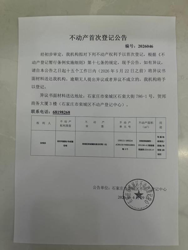 狄伟乐首次不动产登记公告