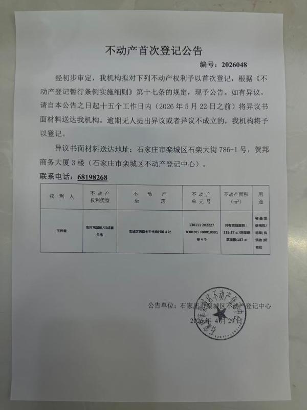 王胜昔首次不动产登记公告