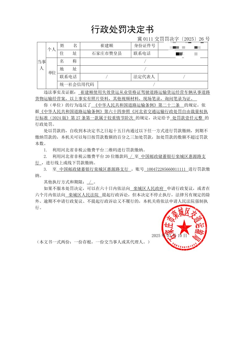 崔建顺使用失效货运从业资格证驾驶道路运输货运经营车辆从事道路货物运输经营案 冀0111交罚罚决字〔2025〕26号